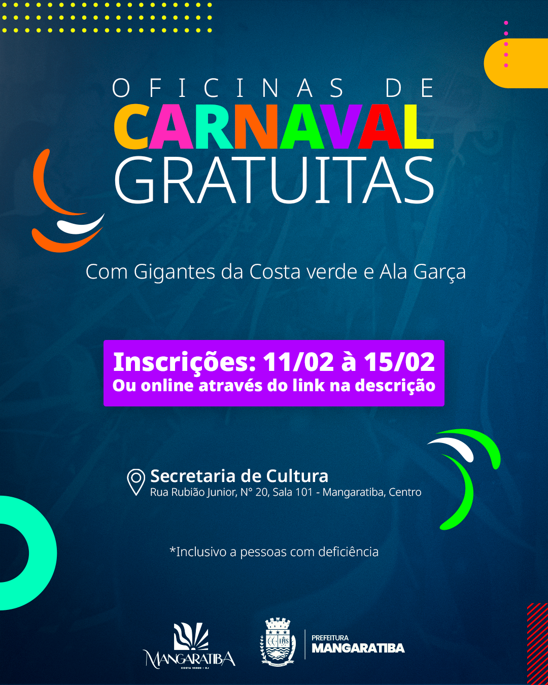 A Prefeitura de Mangaratiba, através da Secretaria de c, vai proporcionar uma experiência de carnaval vibrante para crianças e adolescentes do município. A partir desta terça-feira, dia 11, estarão abertas as inscrições para as Oficinas de Carnaval gratuitas. Podem participar moradores que tenham entre 5 e 18 anos. As oficinas também são inclusivas para autistas e pessoas com deficiências (PcD).