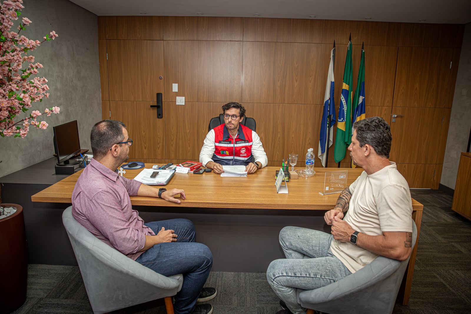 Ao centro, Haroldo Jesus; à esquerda, Milton Valviesse; à direita, Sandro da Hermínio: decreto recompõe salários dos servidores efetivos de Itaguaí (Foto: Italo Dornelles/Comunicação PMI)